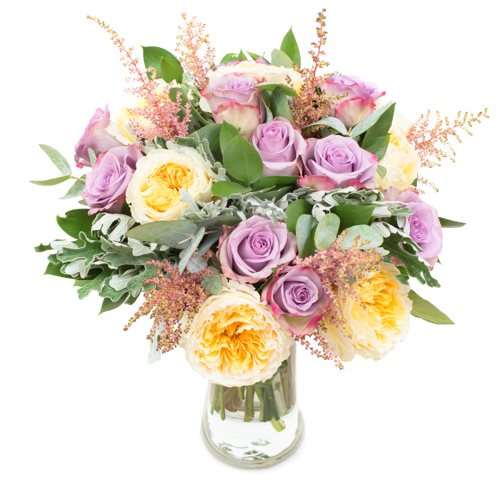 Devotion by Flowers Muswell Hill is a luxurious hand-tied bouquet designed to celebrate life's most special moments. Featuring a romantic blend of rich purple roses, yellow garden roses and soft pink astilbe, this arrangement brings a modern twist to classic elegance. Textured eucalyptus leaves, senecio and glossy ruscus add depth, fragrance and a fresh, natural finish, making it a stunning focal point for any room. Perfect for anniversaries, birthdays, thank-you gifts or simply to brighten someone's day, Devotion is crafted with care by our expert Muswell Hill florists using only premium, long-lasting stems. We guarantee 5 days of freshness, and your flowers are delivered in bud so you can enjoy watching them slowly open and reach their full beauty at home. Available for next-day flower delivery from our Muswell Hill shop for orders placed before 4pm, this bouquet arrives beautifully wrapped and ready to display. Please note: as some flowers are seasonal, we may substitute blooms with similar varieties of equal or greater value to ensure your bouquet looks full, fresh and stylish. Choose Devotion for a chic, thoughtfully designed floral gift that truly shows how much you care.