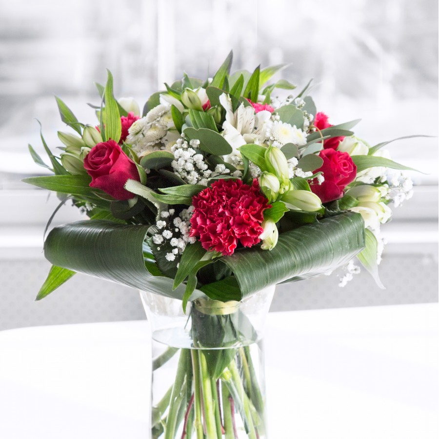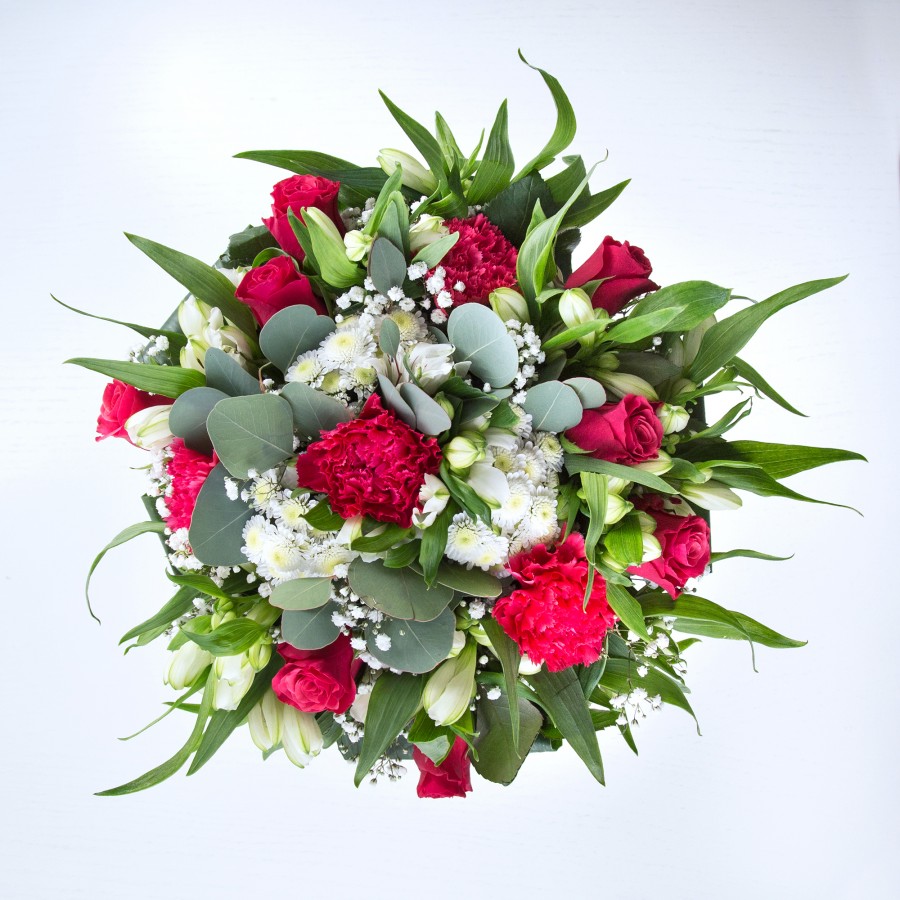 Indulge in the lavish serenity of our Serenity Arrangement. This exquisite bouquet combines crisp white chrysanthemums, delicate gypsophila, and rich red roses, enhanced with elegant carnations.